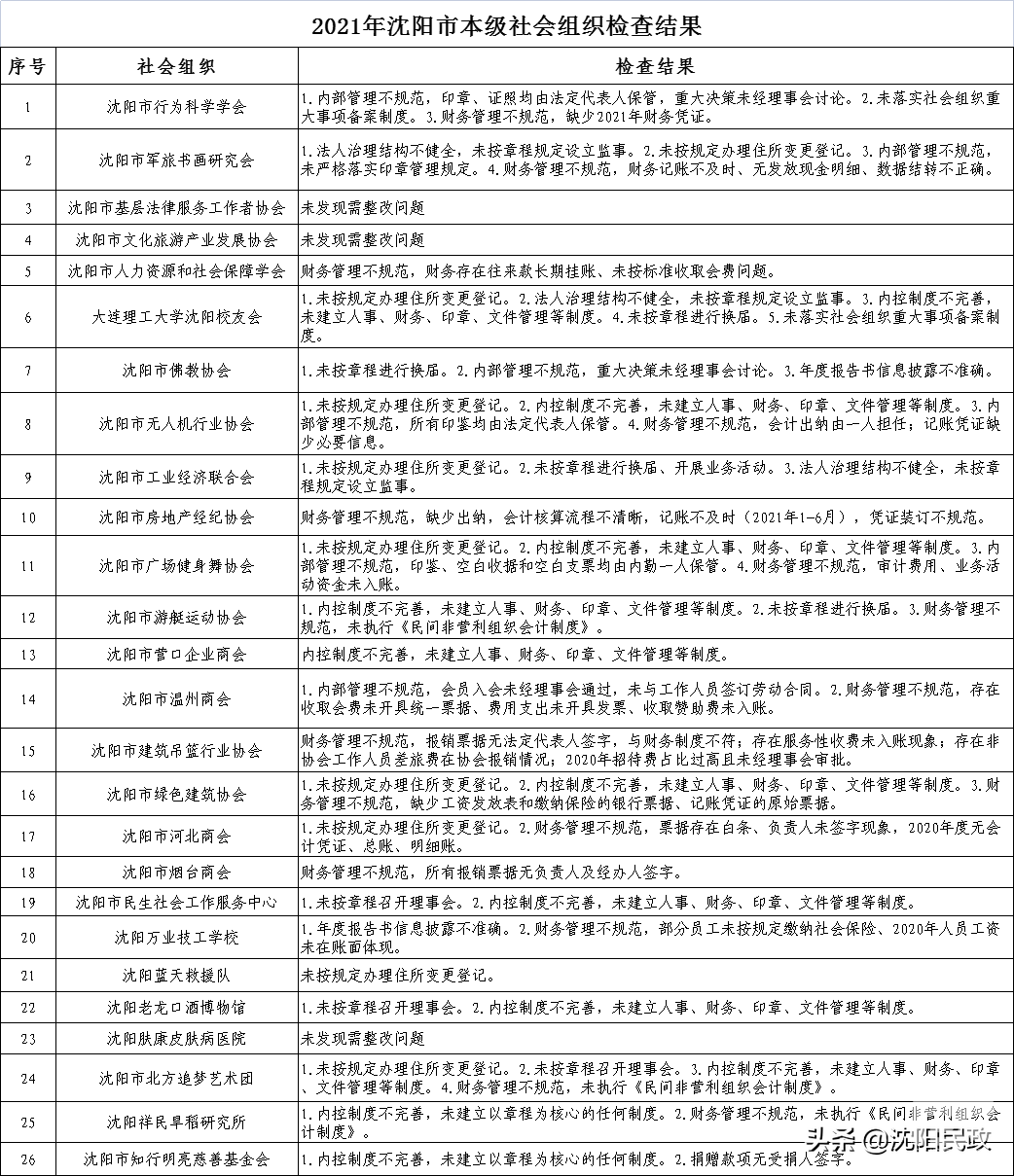 根据《社会组织抽查暂行办法》(民发〔2017〕45 号)、《社会组织信用信息管理办法》(民政部令第60号)和《市民政局关于开展2021年全市性社会组织抽查工作的通知》(沈民发〔2021〕14号)有关规定,2021年,我局对沈阳市行为科学学会等 26 家全市性社会组织开展抽查工作,现将抽查结果向社会公布。社会组织对抽查中发现的问题,要认真进行整改,将整改情况报理事会审议后形成整改报告,于12月15日前报送至沈阳市民政局社会组织管理局。